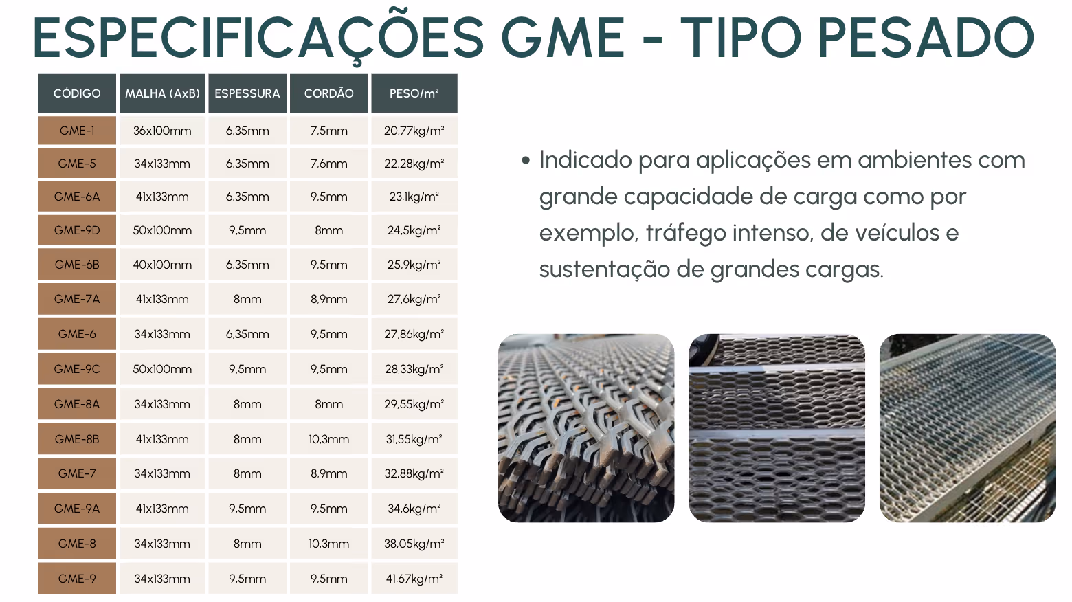 Disponível em diversas malhas e espessuras (4,75 mm / 6,35 mm / 8 mm / 9,5 mm), proporciona: